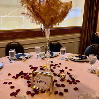 Jessie and Scott hired Legacy Designs for a full day of coordination, decor set up and break down. We premade the main part of their centerpieces by filling our tall crystal towers with gold feathers, complemented by a set of three gold votives. The couple made their table numbers with gold frames and loose rose petals scattered in between. Their faux flower package was luscious and beautiful. The wedding had a great turnout, and the couple had a wonderful time celebrating with their friends and family. Congrats to these newlyweds!